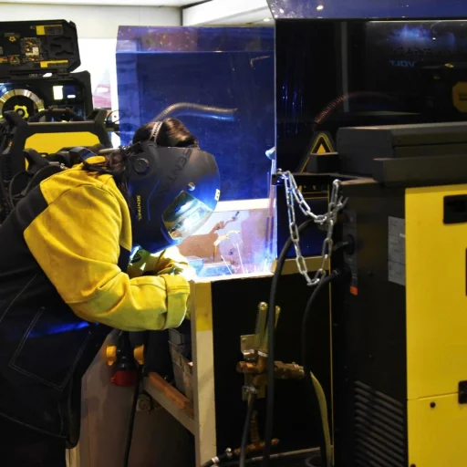 Issy in action, welding on the ESAB Demo Bus back in Summer 2025